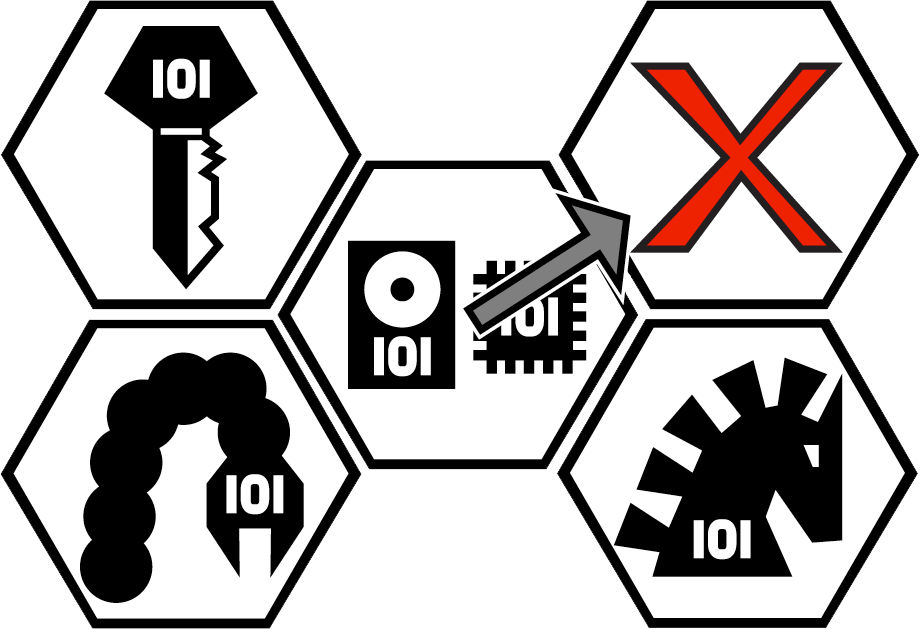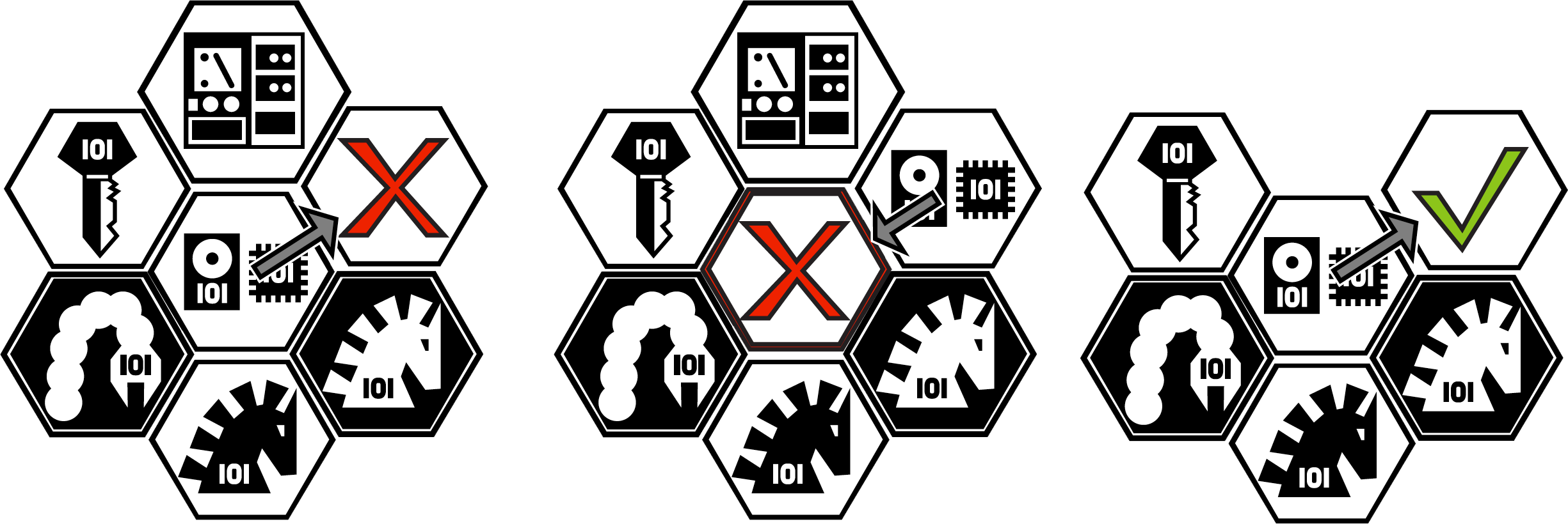 MAINFRAME:Must be placed anytime from 1st to 4th turn. Moves 1 space at a time. If your MAINFRAME is fully surrounded by pieces of either player you lose. |